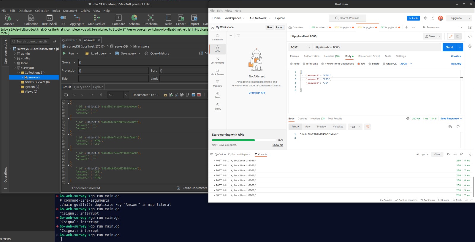 This is a Go application that have a question and the user can send the answer to be stored in MongoDB database using REST API.
