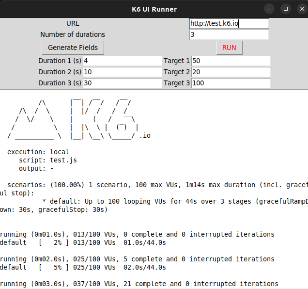 This is a GUI application built with Python and Tkinter for running load tests using k6.